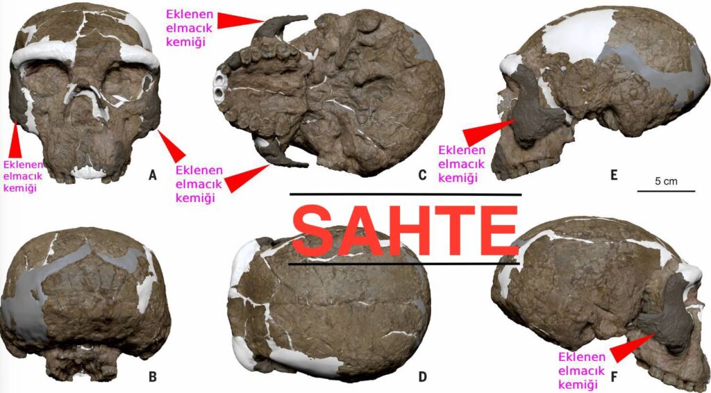Hatırlanacağı üzere, evrimcilerin geçmişte tek bir domuz dişinden “yarı insan” aileler kurguladıkları, insan kafatasına orangutan çenesi monte ederek sahte türler ürettikleri ve fosillere eklemeler yaparak insana benzetilmiş örnekler sundukları birçok kez belgelenmiştir.